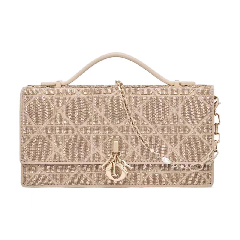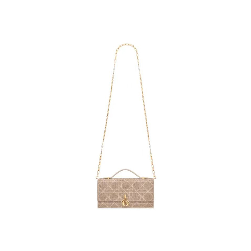 「Miss Dior (ミス ディオール)」ラインに新たに加わった、エレガントで機能的なデザインのミニバッグ。ブラックのコットンを使用し、同系色のマイクロパールで全面に手刺繍を施して「カナージュ」モチーフを描きました。フロントにD.I.O.R.チャームを添えたフラップや、毎日の必需品をすべて収納できるコンパートメントとカードスロットを配し、昼夜を問わず活躍する機能的なアクセサリーに仕上げています。トップハンドルのほか、レジンパールを添えた取り外しが可能なチェーンも付属。ハンドバッグとしてはもちろん、クロスボディバッグとしてもお使いいただけるモデルです。